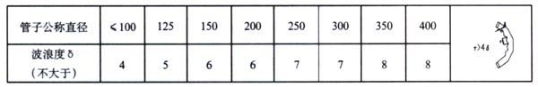 方形補償器制造完成后其中心線尺寸應滿足標準系列所列尺寸要求。其彎管處管壁表面不得有裂紋、金屬分層、過燒等缺陷。其壁厚的減薄量、彎曲半徑、橢圓度,彎曲部分波浪度及幾何尺寸偏差值不應超過表2、表3的規定。