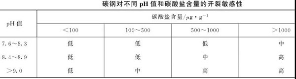 2含量超過 2% 、溫度高于93℃時可能存在開裂傾向;下表為碳鋼對不同pH值和碳酸鹽含量的開裂敏感性。