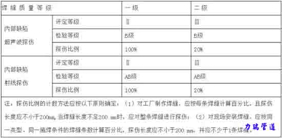 設計要求全焊透的一、二級焊縫應采用超聲波探傷進行內(nèi)部缺陷的檢驗,超聲波探傷不能對缺陷作出判斷時,應采用射線探傷,其內(nèi)部缺陷分級及探傷方法應符合現(xiàn)行國家標準《鋼焊縫手工超聲波探傷方法和探傷結(jié)果分級》GB11345或《鋼熔化焊對接接頭射結(jié)照相和質(zhì)量分級》GB3323的規(guī)定。