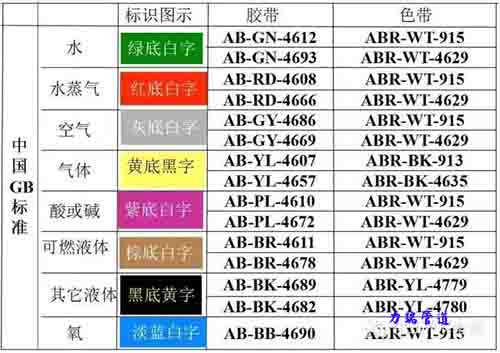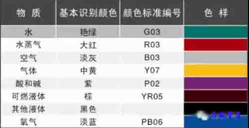 據(jù)管道內(nèi)物質(zhì)的一般性能,分為八類,并相應(yīng)規(guī)定了八種基本識別色和相應(yīng)的顏色標準編號及色樣。