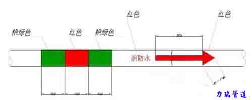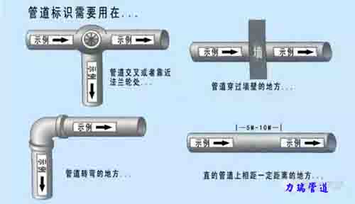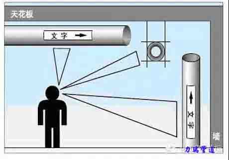 能夠在不同的角度都能看到,如經(jīng)過閥門時的每個方向,穿過墻體的兩端,拐角的兩個方向等,在直的狀態(tài)下,建議每隔25'(7,620mm)-50'(15,240mm)進行一次標示。