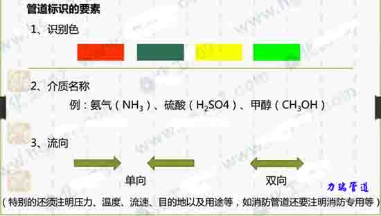 1 、管道介質(zhì)的標識由色環(huán)、介質(zhì)名稱、流向三部分組成。