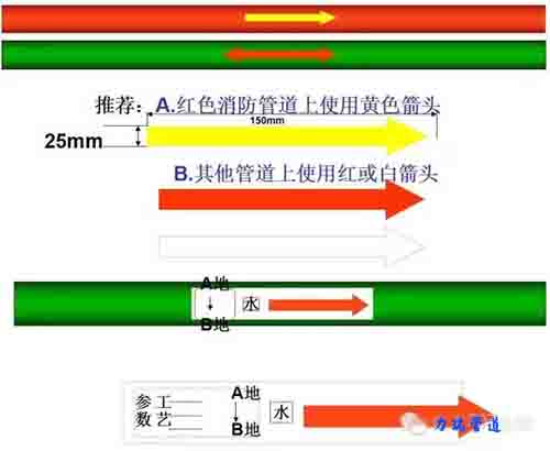 1、一般在不同流體的管道表面或管道絕熱層外表面,涂覆不同顏色的涂料,有時也可涂刷指向箭頭,標出介質(zhì)的流向作為標識。