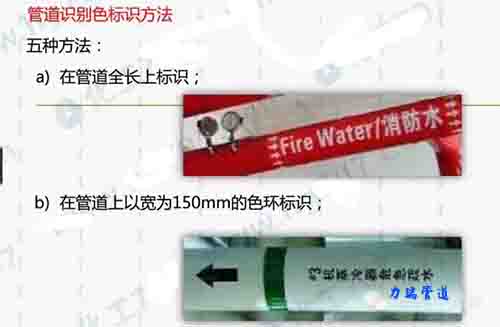 管道全長上標識; 在管道上以寬為150mm的色環(huán)標識,兩個標識之間的最小距離應(yīng)為10m,其標識的場所應(yīng)該包括所有管道的起點、終點、交叉點、轉(zhuǎn)彎處、閥門和穿墻孔兩側(cè)等的管道上和其他需要標識的部位,識別符號由物質(zhì)名稱、流向和主要工藝參數(shù)等組成。