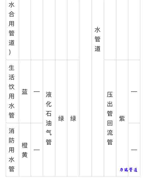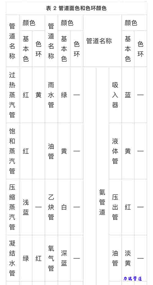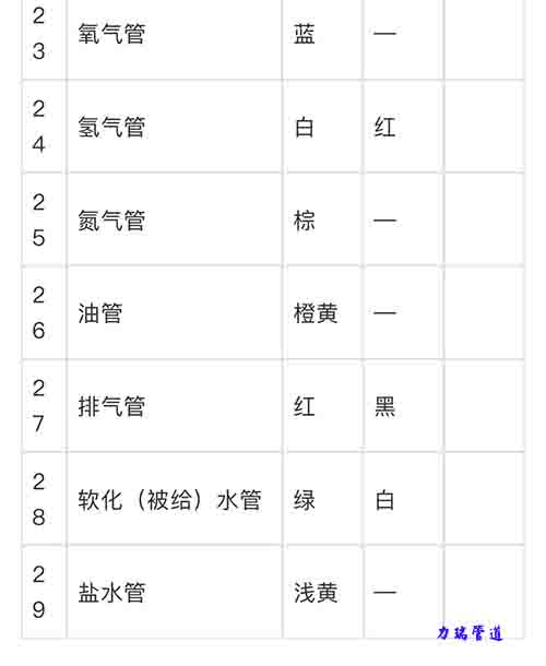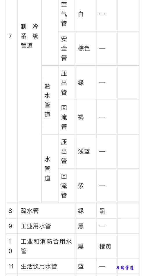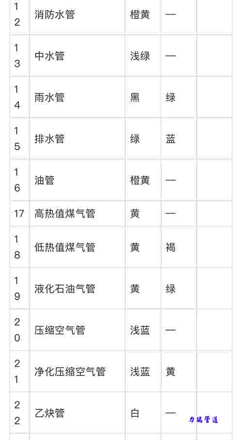 由于管道的工程的內(nèi)容不一,管道內(nèi)流體流動的介質(zhì)種類較多,所以管道的涂色和標識應(yīng)根據(jù)具體工程情況進行使用,以易于操作、方便管理及維修為原則。因此,各系統(tǒng)的規(guī)定不統(tǒng)一,工程中設(shè)計有規(guī)定時應(yīng)按設(shè)計規(guī)定涂色,設(shè)計無規(guī)定時,可按下表 所列使用。