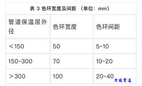 1、色環(huán)的間距應(yīng)分布均勻,便于觀察,一般在直管段上其間距以 5m 左右為宜。色環(huán)的寬度可按管徑大小來確定,外徑(包括絕熱層)在 150mm 以內(nèi),色環(huán)寬度為 70mm;外徑在 300mm 以上者,色環(huán)寬度為 100mm。