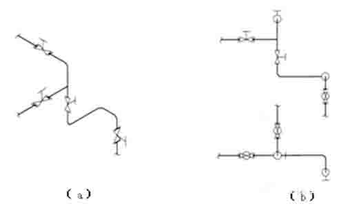 管道流程線要用水平和垂直線表示,管道轉彎處一般畫成直角。應避免穿過設備或交叉,在不可避免時,將其中一管道斷開一段,一般同一物料線交錯,按流程順序“先不斷、后斷”;不同物料線交錯,按“主不斷、輔斷”繪制。