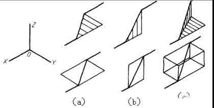 2)當管道平行于直角坐標軸時,軸測圖用平行于對應的軸測軸的直線繪制;當管道不平行于直角坐標軸時,應畫出平行于相應坐標軸的細實線,表示管子所處的平面;管道在水平面內傾斜時,畫出與y軸平行的細實線(構成水平面),(a)管道在鉛垂面內傾斜時,畫出平行于Z軸的細實線(構成鉛垂面),(b)管道是一般位置時,需要同時畫出與Y軸和Z軸分別平行的細實線,如圖(c) 所示。