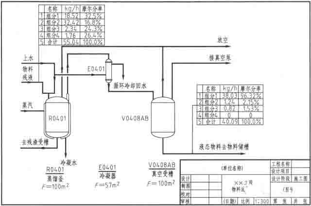 3)常采用圖形與表格結合的形式,并配以物料流程線,同時在流程線上標注出各物料的名稱、流量以及設備特性數據等。
