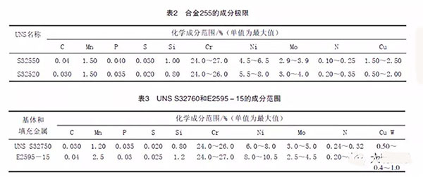表2比較了UNSS32550與用于堆焊的UNSS32520的成分,其成分大體上相同,但是,UNS S32520的最低氮含量要比UNS S32550高,所以,很清楚,UNS S32520更適用于焊后狀態的用途。另外,也可使用UNSS32550,但是,要把該鋼種成分的氮含量控制在上限才行。