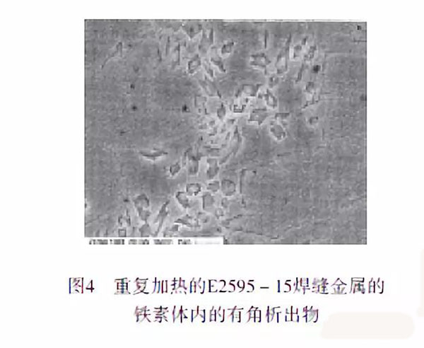 為了找出焊縫金屬沖擊試驗結果不高的原因,利用掃描電子顯微鏡檢測了工藝評定測試用的焊縫試樣。圖4所示為試樣中部厚度附近焊縫金屬的顯微組織。僅在鐵素體內就有大量的有角析出物。但是沒有準確確定到底是什么析出物。我們的結論是析出物是在對測試試樣進行十二道次的焊接時反復重復加熱產生的。