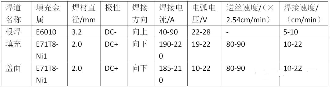 焊條電弧焊時,打底焊采用纖維素型焊條E6010,符合AWSA5.1的規定,直徑為3.2mm;填充、蓋面焊采用E5015焊條,符合GBT5117-1995的規定。藥芯焊絲半自動焊時,打底焊采用纖維素型焊條E6010,符合AWSA5.1的規定,直徑為3.2mm;填充、蓋面焊采用藥芯焊絲E71T8-Nil,符合AWSA5.29的規定,直徑為2.0mm,該焊絲具有操作性能好,焊接質量高、抗風能力強等優點。