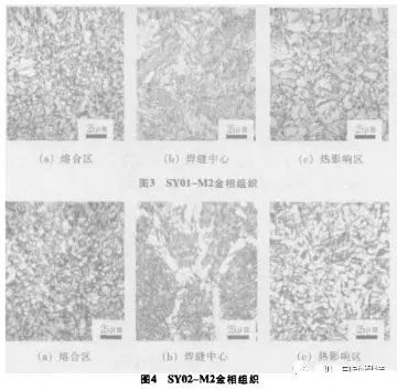 對于管道環焊縫接頭的12,3,6點位置的金相試件進行了認真觀察。采用焊條電弧焊方案得到的3點位焊接接頭金相組織照片如圖3所示;采用藥芯焊絲半自動焊得到的3點位置處焊接接頭金相組織照片如圖4所示。