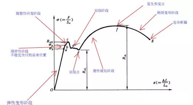 這一階段的最大、最小應(yīng)力分別稱為上屈服點(diǎn)和下屈服點(diǎn)。由于下屈服點(diǎn)的數(shù)值較為穩(wěn)定,因此以它作為材料抗力的指標(biāo),稱為屈服點(diǎn)或屈服強(qiáng)度(ReL或Rp0.2)。