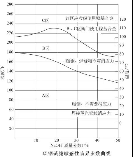 下圖為金屬堿脆敏感性臨界參數曲線,碳鋼在溫度低于 46℃ 的環境不會發生堿脆。在溫度高于 82℃ ,且 NaOH 質量分數大于 5% 時,有很高的開裂敏感性。關于溫度的影響,需要考慮的是金屬接觸堿液的實際溫度,而不僅僅是正常的工藝溫度,有許多常溫輸送堿液管道,在安裝有蒸汽伴熱的情況下,發生過堿脆。