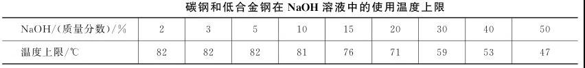如,含質量分數 0.73% 的 Ti ( C 質量分數 0.105% )鋼試樣,經 650~750℃ 的保溫,然后爐冷,使到達斷裂時間從 150h 延長到 1000h 。按HG / T20581的7.8 使用介質的限制,碳鋼和低合金鋼在NaOH 溶液中的使用溫度上限見下表。