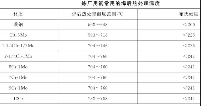 碳鋼和低合金鋼焊后去應力退火溫度不低于 620℃ ,并按照 1h / 25mm (厚度)計算保溫時間。下表是煉廠用鋼常用的焊后熱處理溫度范圍,硬度值可以作為熱處理效果的判據。
