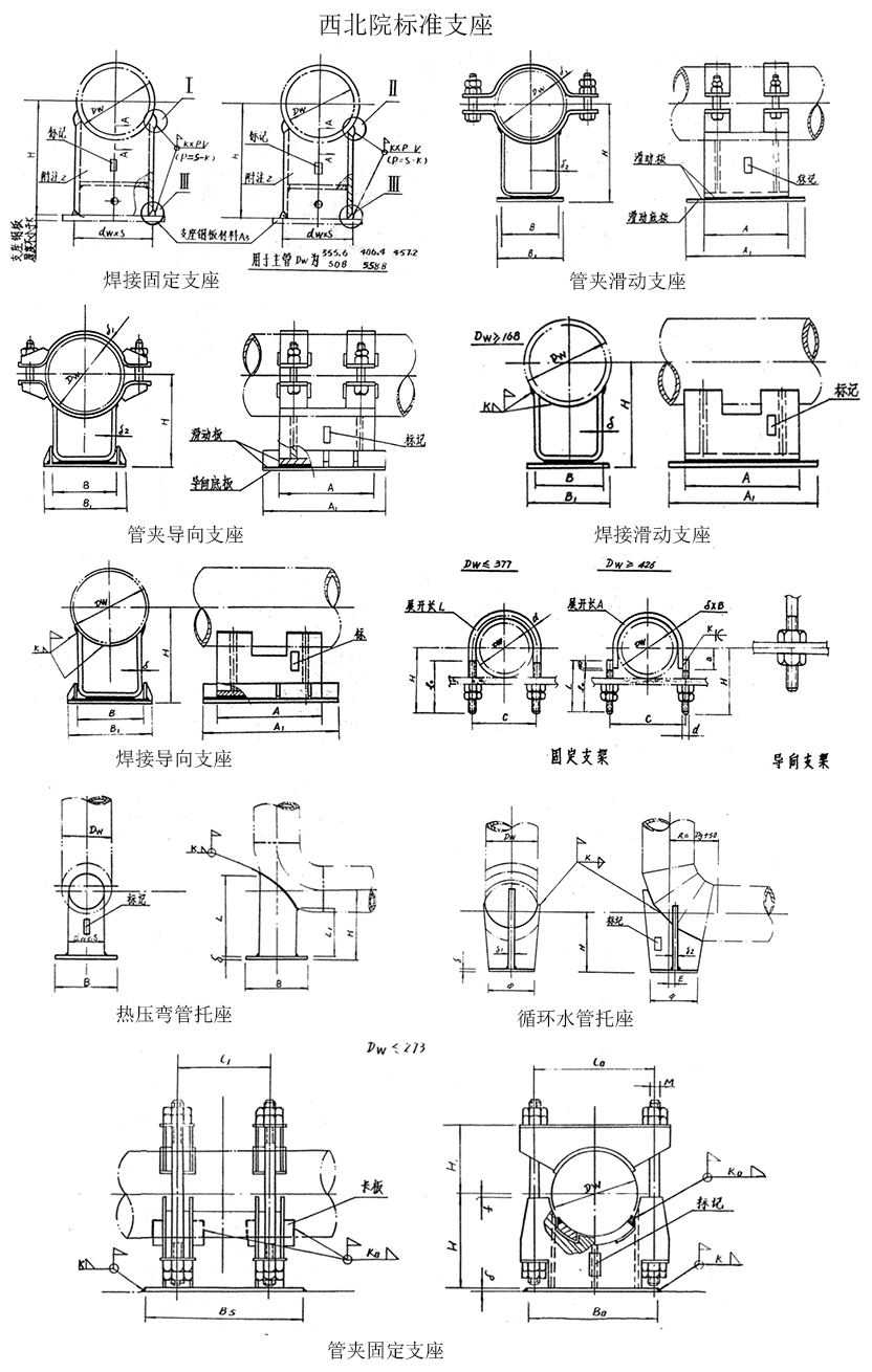 Z1 管夾固定支座、Z2/Z2A 焊接固定支座、Z3 管夾滑動(dòng)支座、Z4 管夾導(dǎo)向支座、Z5 焊接滑動(dòng)支座、Z6 焊接導(dǎo)向支座、Z7 管卡(無保溫)、Z11熱壓彎管托座、Z13 循環(huán)水管托座